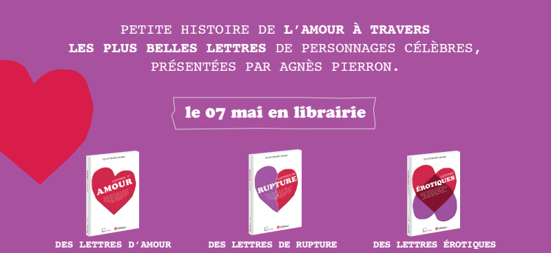 Notre second partenaire est « MOTS INTIMES », une nouvelle collection consacrée à l’art épistolaire et à l’amour des mots des éditions Le Robert. À découvrir le 7 mai 2015 en librairie, trois premières anthologies nous invitent à pénétrer dans l’intimité d’auteurs, d’artistes, d’hommes politiques et de penseurs en proie aux délices raffinés de la séduction, aux exquises brûlures de la passion… ou aux terribles affres de l’amour en fuite. L’un d’entre vous remportera donc un exemplaire de la trilogie Lettres d’amour, Lettres érotiques et Lettres de rupture d’Agnès Pierron.
